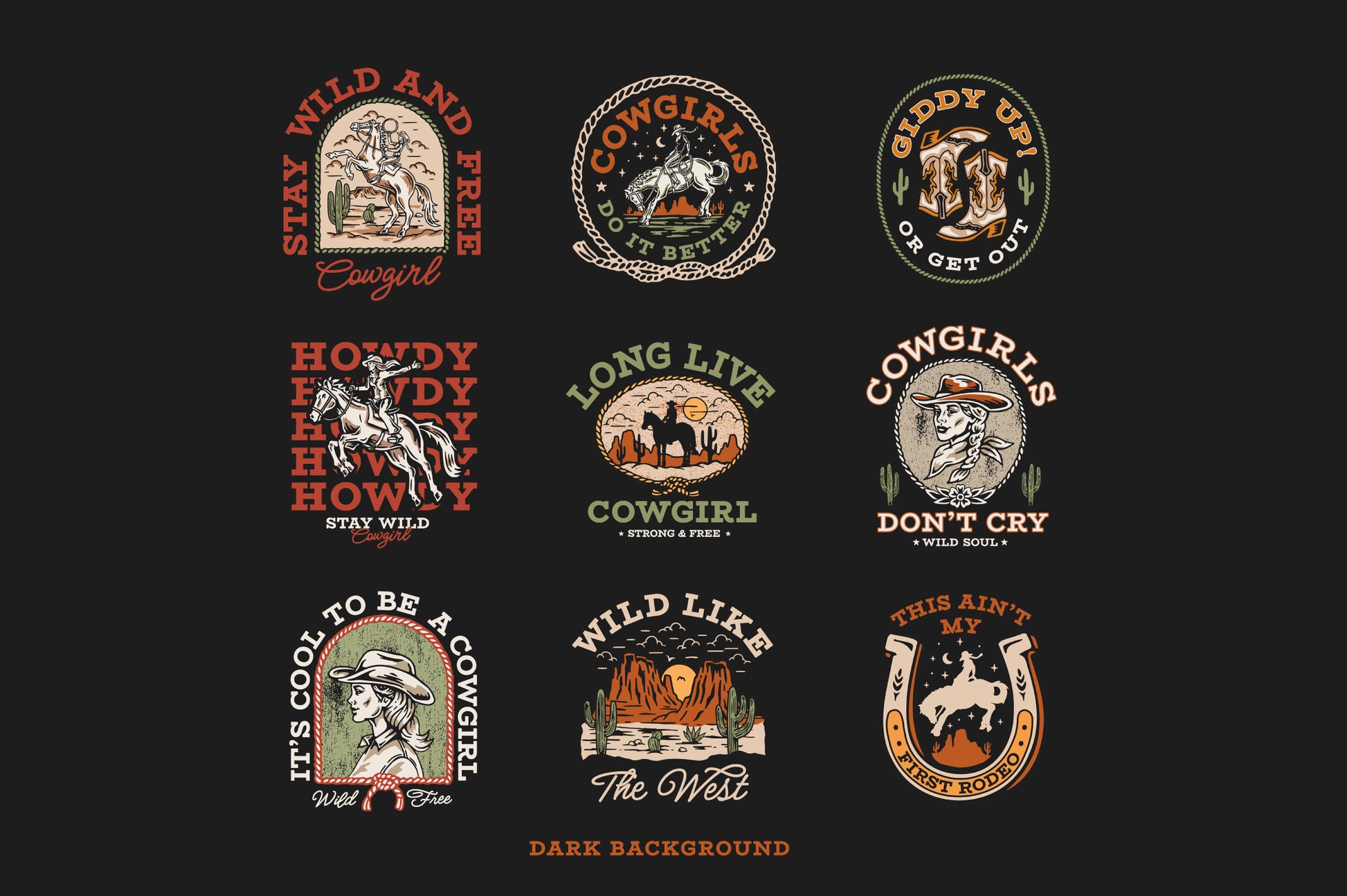 9 Fully editable cowgirl designs. The editable fonts make them customizable for t-shirt prints, posters, or mugs.