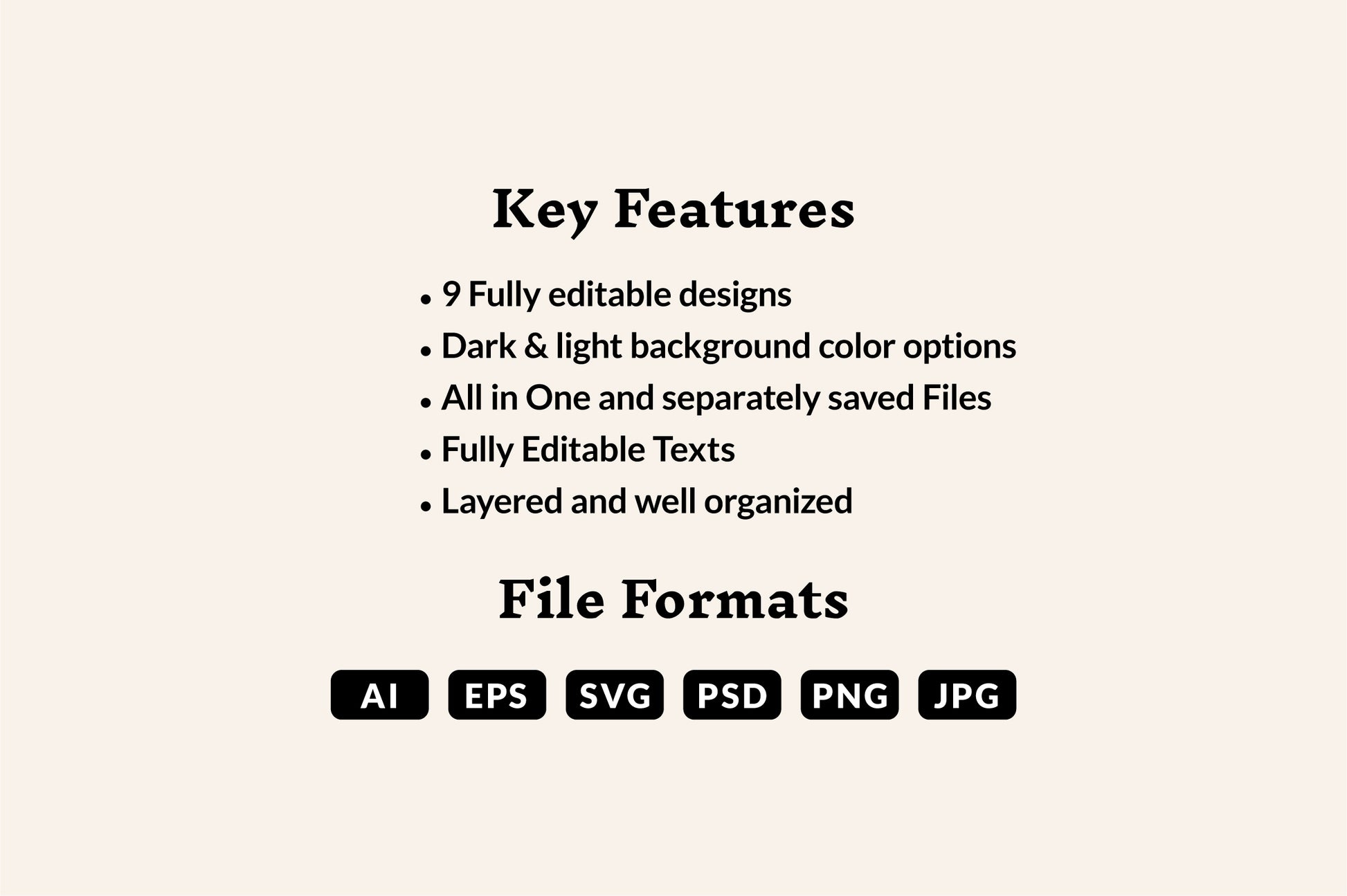 - Includes 9 all-in-one and individual saved files in Vector AI, EPS, SVG formats, 300 dpi PSD, JPEG, and PNG files.