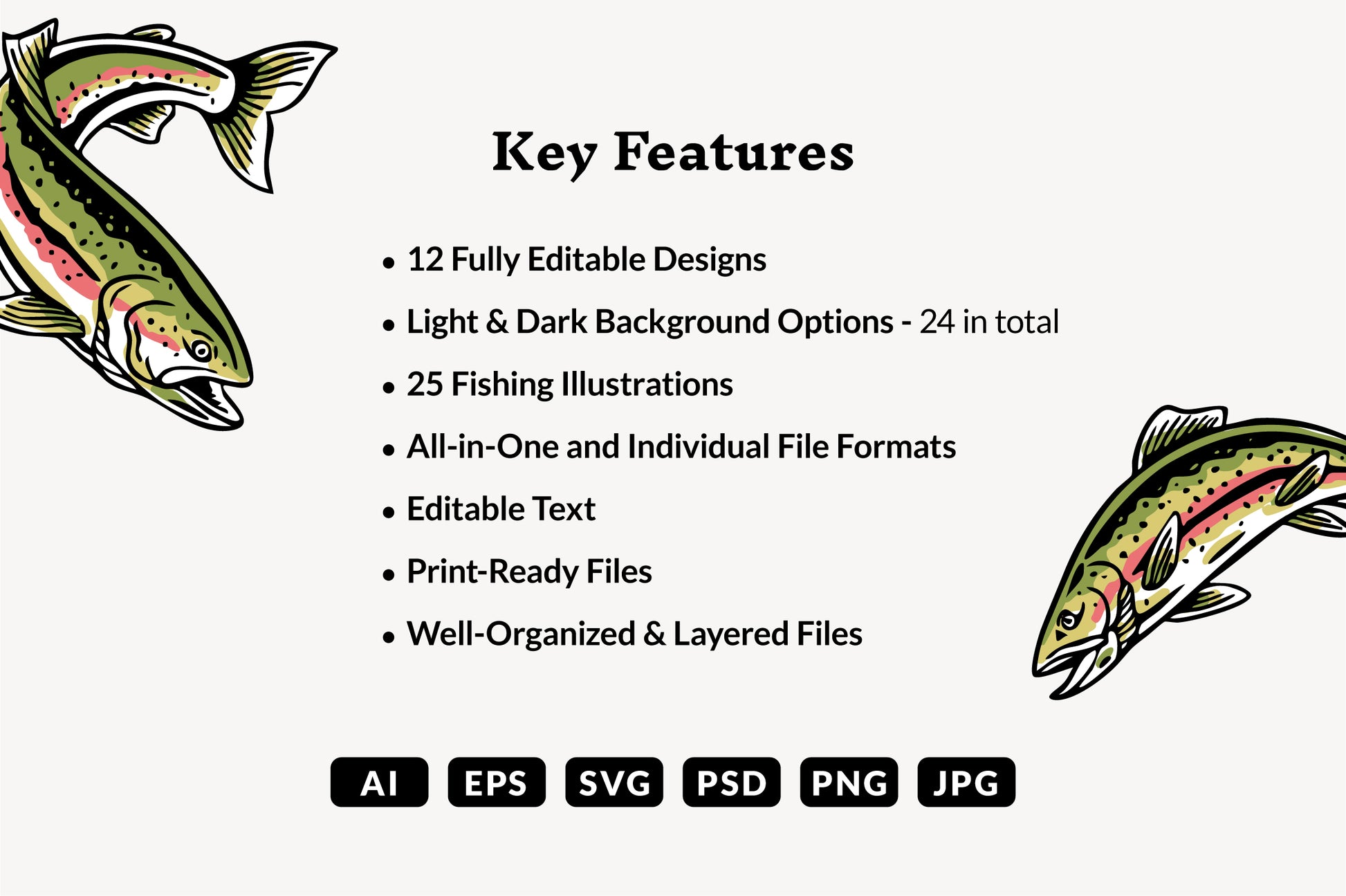 - 12 all-in-one and individually saved files in Vector AI, EPS, SVG formats, 300 dpi PSD, JPEG, and PNG files.