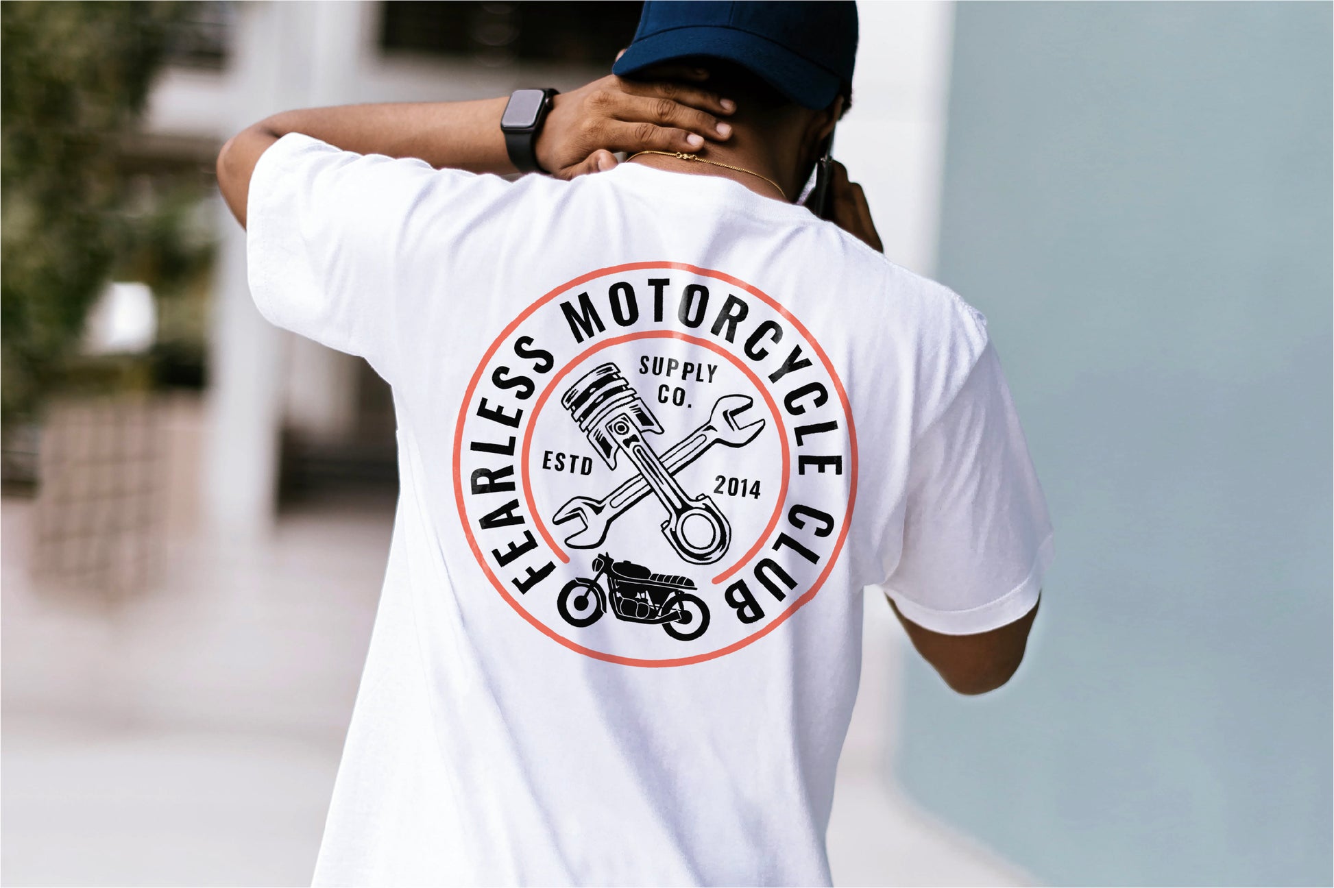 Set of 9 fully editable motorcycle-themed badges with customizable fonts, perfect for t-shirt prints, posters, or mugs.