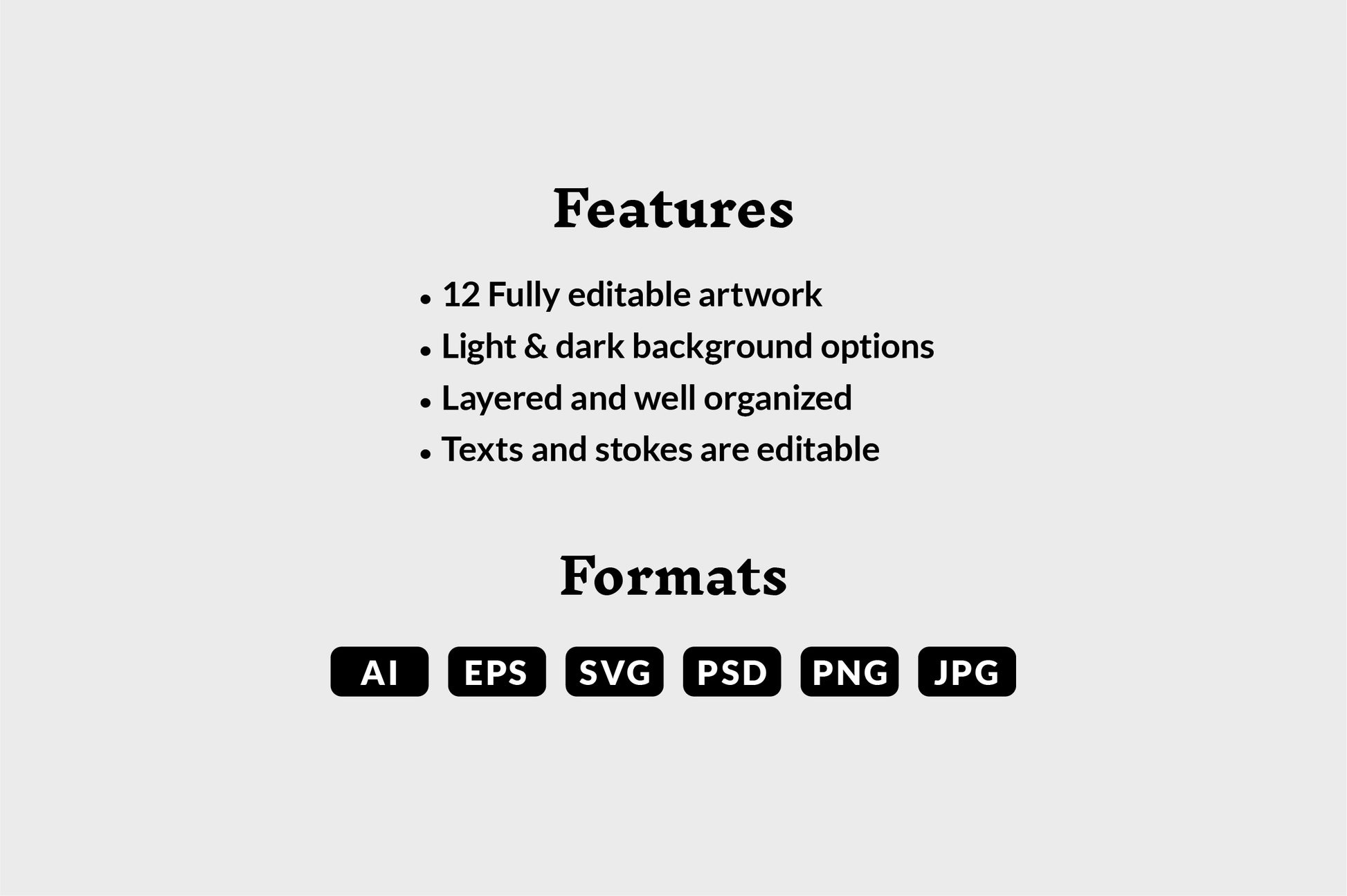 - 12 All-in-one and separate Vector AI, EPS, SVG, and 300 dpi PSD, JPEG, and PNG files.